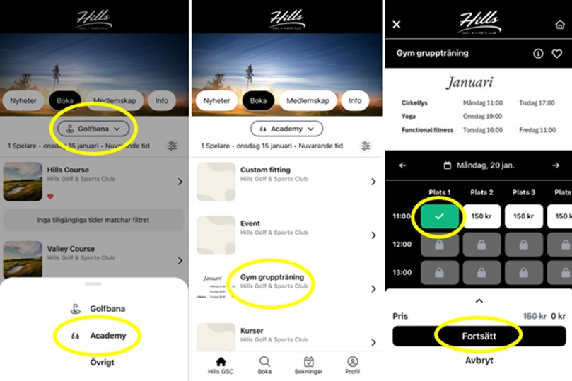Eftersom antalet platser på träningspassen är begränsade behöver du förboka din plats. Bokningen sker i appen Sweetspot under knappen ”Boka”. Där väljer du ”Academy” istället för ”Golfbana” och går sedan vidare till ”Gym gruppträning”. I nästa steg väljer du dag och bokar in dig på en ledig plats.